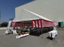 テント1.5間x2間、紅白短幕、椅子8脚、ブルーシート