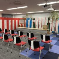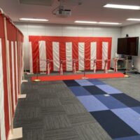 愛知県名古屋市 新施設完成の竣工式のレンタル設営 シャッターなしの開放された建物内での設営だったため風が吹いても大丈夫なようにしっかりと幕を固定し設営しました 早朝からの式典だったためストーブを多数用意し、寒さ対策をし …