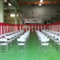 愛知県名古屋市 施設完成の竣工式のレンタル設営 某企業様新社屋完成の竣工式 大規模物流倉庫内で行われた竣工式 席の間隔もしっかりとって招待させていただいたお客様へも最高のおもてなしを行えるように設定されております(^_ …