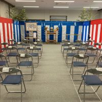 愛知県名古屋市 施設完成の竣工式のレンタル設営 某企業様新社屋完成の竣工式 30名様ほどの竣工式ですが席の間隔は充分に取っての会場設営 冷房設備がないので扇風機も6台設置 細部にまで綺麗の設営させていただいた竣工式にな …