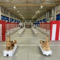 愛知県名古屋市 某企業様物流倉庫完成の竣工式のレンタル設営 広大な倉庫内に竣工式会場を設営しての竣工式 建物の完成を関係を含む30名様ほどで神様へご報告する式典になりました 愛知県で地鎮祭・竣工式設営ならシンサイサービ …