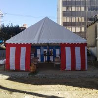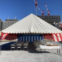 愛知県名古屋市 公共工事新築着工の地鎮祭 レンタル設営 公共工事着工の地鎮祭ということで直会テントも準備し、しっかりした内容で起工式会場設営をさせていただきました 3間x6間テントに3間x4間テントを並列 神事も直会も …