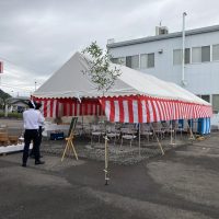 愛知県名古屋市 施設新築着工の地鎮祭 レンタル設営 この起工式は参加人数は30名様ほどになりましたがソーシャルディスタンスの関係でテントは3間x4間テントを2張りで3間x8間スペースを確保 席の間隔をしっかりあけて感染 …
