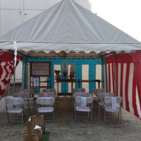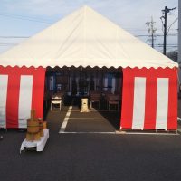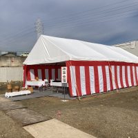 愛知県名古屋市 某企業様新築着工の地鎮祭 レンタル設営 人数少なめですがお客様へ配慮し、テントは3間x4間テントを2張り準備し席の間隔を広げております アスファルト上に設営でありましたが風もなくとても穏やかな地鎮祭にな …