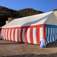 愛知県名古屋市 某企業様新築着工の地鎮祭 レンタル設営 大手ゼネコン様の工事着工の地鎮祭ということで少人数ではありますが4間x10間スペーステントを準備し、しっかりした内容で起工式会場設営をさせていただきました 砂利敷 …