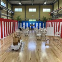 愛知県名古屋市 竣工式・テープカットのレンタル設営 某企業様 新工場兼事務所完成の竣工式 作業場を利用して3間x6間スペースの竣工式会場を設営 フローリング貼りの綺麗な室内に設営させていただきました(^_-)-☆ 愛知 …