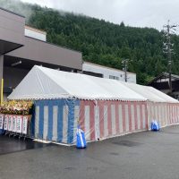 愛知県名古屋市 竣工式のレンタル設営 某企業様 精肉加工所完成竣工式・テープカットの式典 建物の完成を祝い竣工式の挙行 建物内に充分なスペースがないとのことで外でテントを設営しての竣工式 3間x4間テントを2張り使用し …