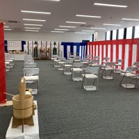 愛知県名古屋市 竣工式のレンタル設営 某企業様 新築完成竣工式・テープカットの式典 大会議室を利用しての竣工式 広い会議室に目いっぱい紅白幕を準備し、席の間隔をできるだけあけてコロナ禍を意識した竣工式設営をさせていただ …