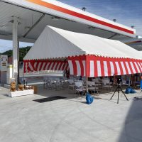 愛知県名古屋市 竣工式のレンタル設営 某企業様 ガソリンスタンドオープンの竣工式 新しく建設されたガソリンスタンドの竣工式の準備をさせていただきました(^^♪ 天気も良く綺麗なコンクリートに綺麗なテントでなんか映えてま …