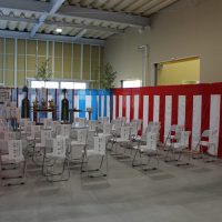 愛知県名古屋市 某企業様の竣工式のレンタル設営 新しく建設された工場の竣工式 広い倉庫の一角に竣工式会場を設営し、式典を執り行いました 30名様ほどが参列される竣工式になりましたが神事会場と直会会場とを分けて行うスタイ …
