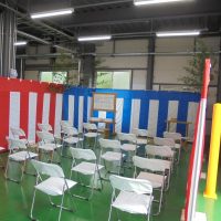 三重県名張市 竣工式の設営 レンタル 某企業様 新工場完成の竣工式 工場内の限られたスペースを利用しての竣工式設営になりました 20名様がご参列で2間x4間スペースの神事会場 少し狭い感じは致しますが入口や窓などを開放し …