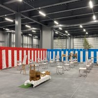 愛知県名古屋市 某運輸会社様の竣工式のレンタル設営 名古屋市に新しく完成した事務所倉庫の竣工式を倉庫内で執り行いました ソーシャルディスタンスを保つため会場は大きめに設定しかなりの間隔をとることができております 4間x …