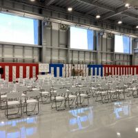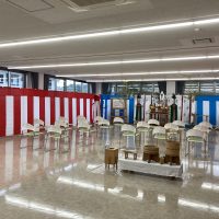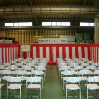 愛知県豊田市 竣工式の設営 レンタル 企業様 新社屋の完成の竣工式 新社屋倉庫内にて執り行われた竣工式 限られたスペースにての式典になりましたがしっかりと会場設営させていただきました 2間x4間スペースで紅白幕・椅子・机 …