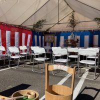 愛知県名古屋市 地鎮祭・起工式の設営 レンタル 某企業様新工場建設の地鎮祭 少人数ではあるもののコロナ禍を意識し、3間x6間テントを使用 暑さが厳しいため扇風機とスポットクーラーも準備し万全の準備をさせていただきました …
